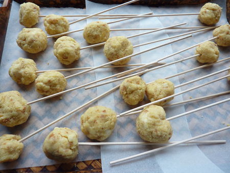 Plantez les piques à brochettes au coeur de chaque boule de pâte puis placez le tout deux bonnes heures au frais, afin que les boules soient bien fermes et puissent être décorées sans casser.