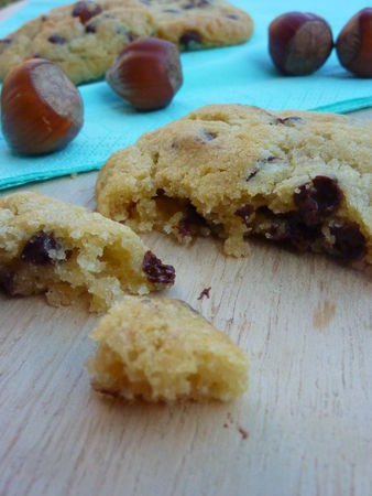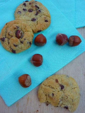 Recette trouvée sur le blog turbigo-gourmandises, légèrement modifiée pour devenir des cookies choco-noisettes!