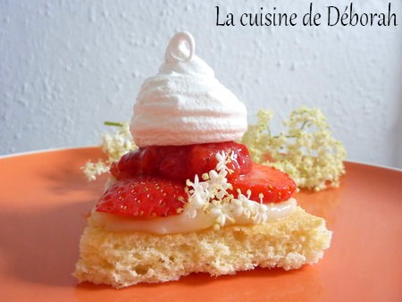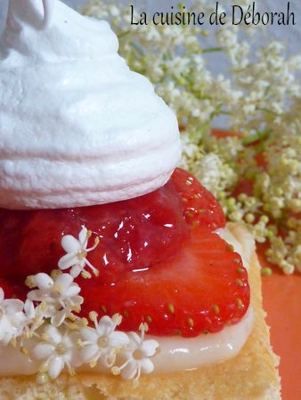 Fraise, sureau, génoise, gelée de fraise, crème pâtissière, meringue