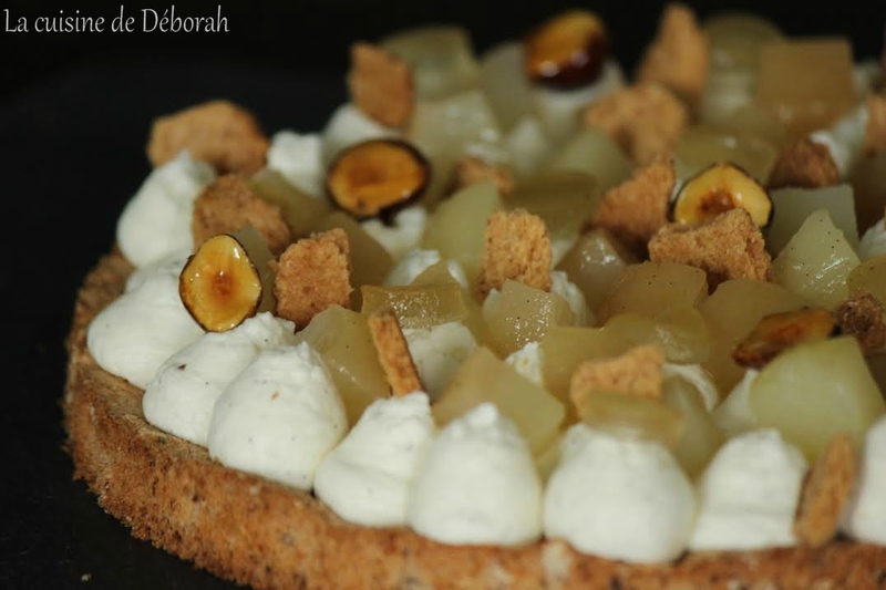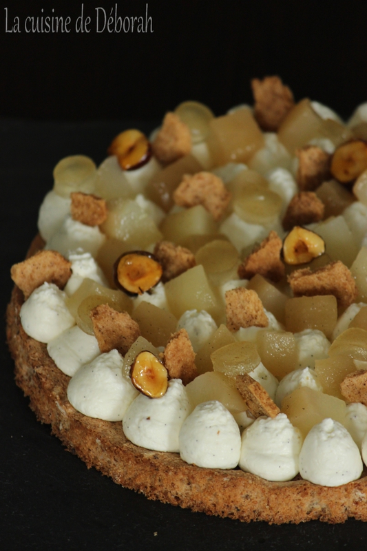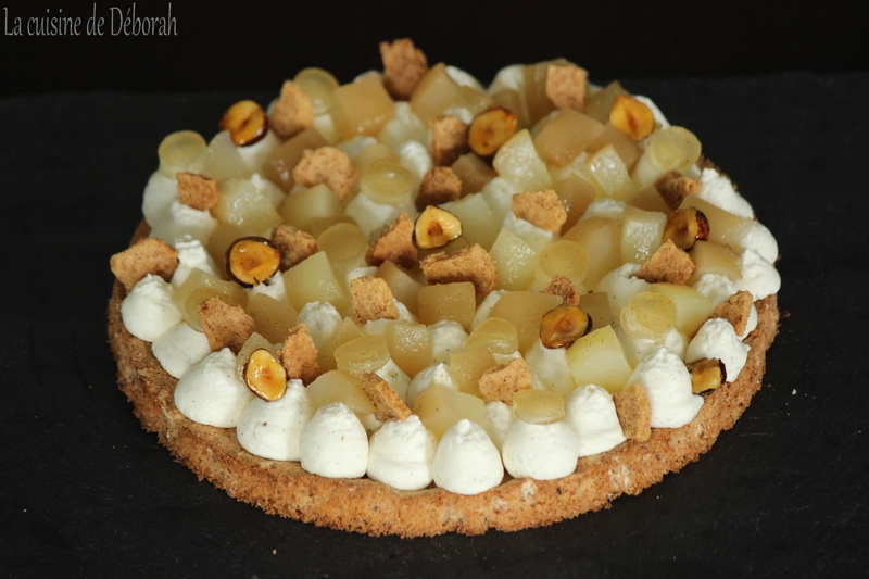 J’ai fais une version épicée, composée d’un biscuit noisettes, de dés de poires pochées aux épices, de gelée au gingembre, de sablé fève tonka, de Chantilly vanillée au mascarpone et de noisettes caramélisées.