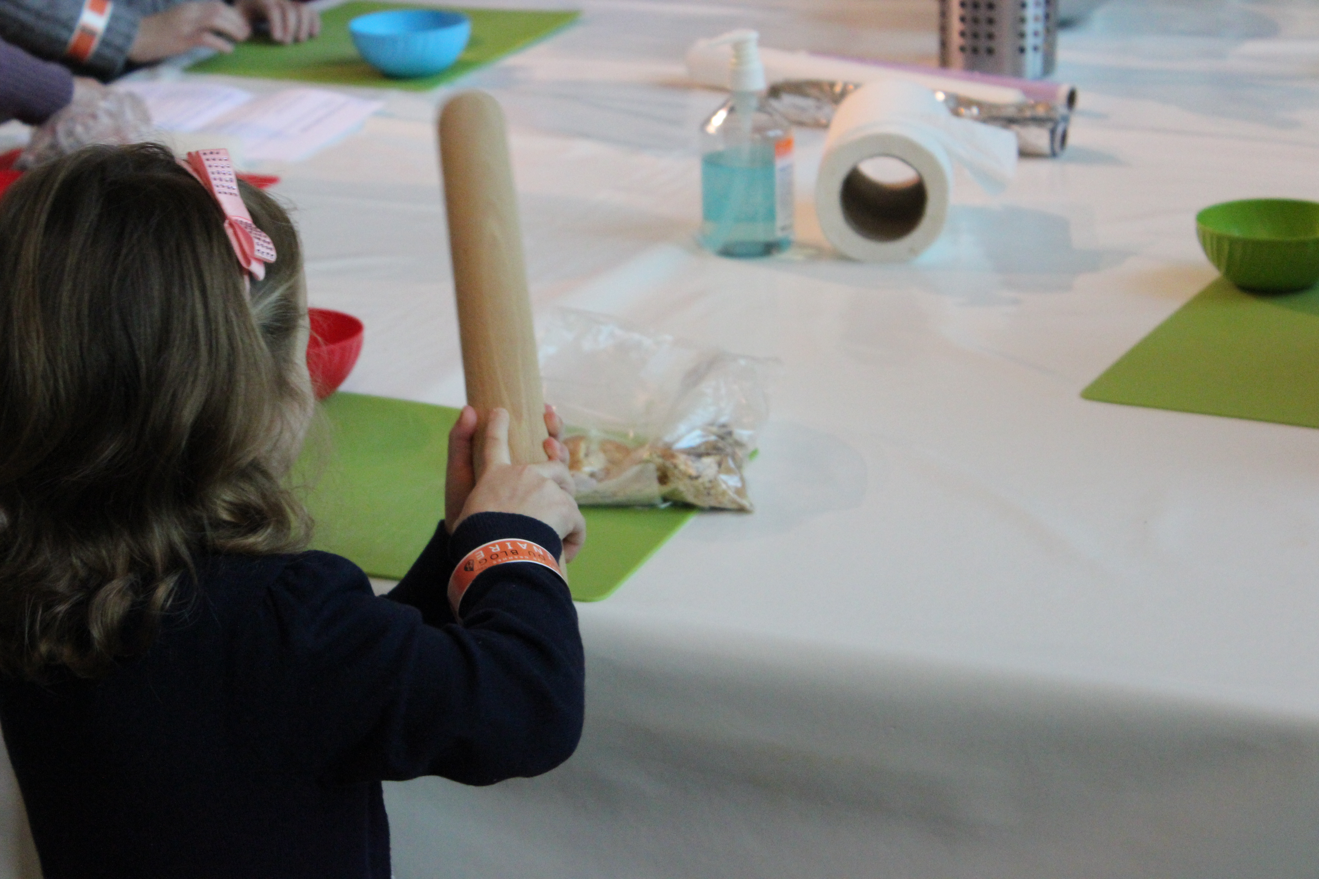 On commence par le plus drôle, taper sur les biscuits avec un rouleau à pâtisserie, pour en faire de la poudre!