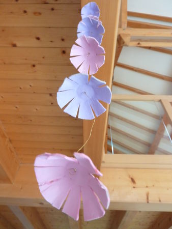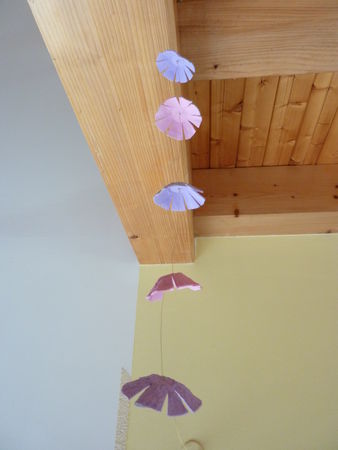 Ces guirlandes ornaient les poutres en tombant juste au dessus de la table en petites fleurs mauves et roses (elles sont toujours en place d’ailleurs!) C’est très simple à réaliser et ça ne coûte rien!