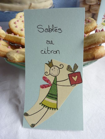 J’ai procédé comme pour les cartes souvenirs en découpant ces petites fées sur ce fameux papier cadeau, je les ai collées sur des cartes Pollen bleues légèrement pailletées (je n’ai plus l’emballage) que j’ai découpé pour avoir la dimension voulue, il ne me restait plus qu’à y noter le nom des douceurs!