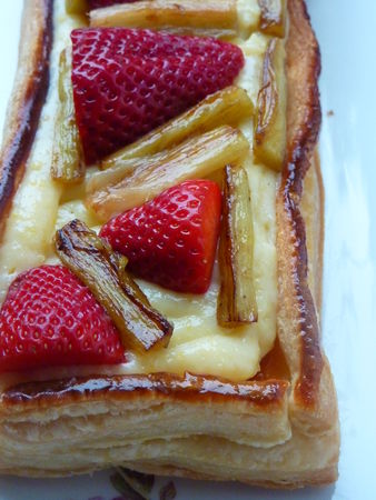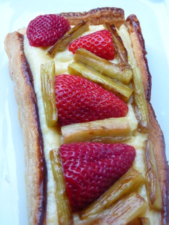 millefeuille, crème pâtissière, rhubarbe, fraises, pâte feuilletée